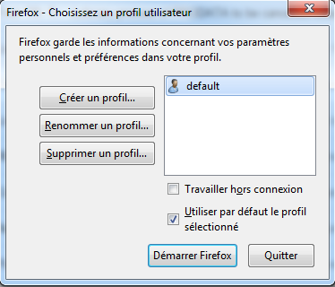La fenêtre de gestionnaire de profile apparaît et il ne reste plus qu’a sélectionner le bon profile (voir à supprimer les anciens) et à démarrer Firefox. Tout doit alors fonctionner parfaitement à nouveau.